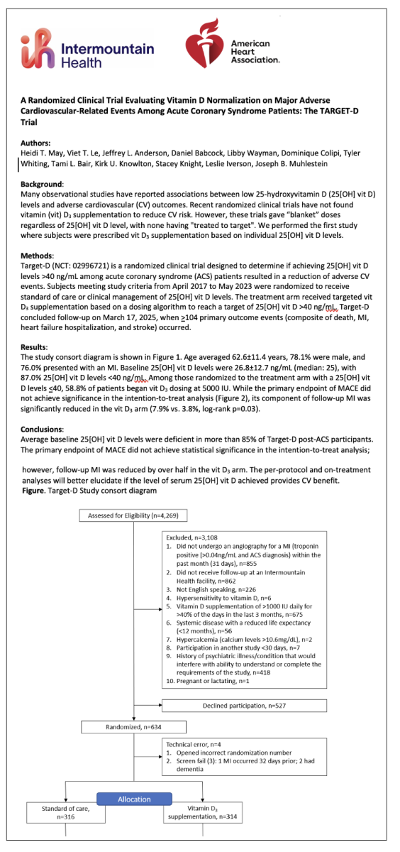 “We observed no adverse outcomes when giving patients higher doses of vitamin D3 supplementation, and to significantly reduce the risk of another heart attack, which are exciting results,” said Dr. May. “We’re excited with these results but know we have further work to do to validate these findings.”